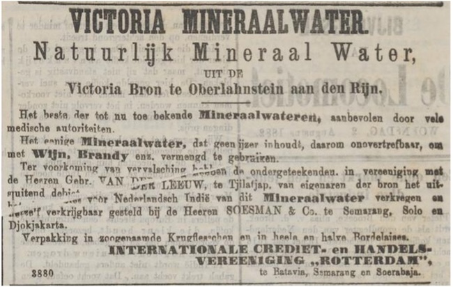 Iklan air mineral Hygeia (di atas) dan Victoria Mineraalwater (di bawah) dalam surat kabar masa kolonial. (De Locomotief, 08-10-1884; De Locomotief, 06-11-1931)