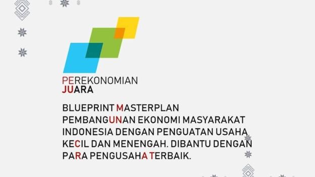 Red letters spell ‘semen squirts’. Full poster reads, ‘Champion economy: A masterplan blueprint for Indonesian people’s economic development by strengthening small and medium enterprises. Helped by the best businesspeople.