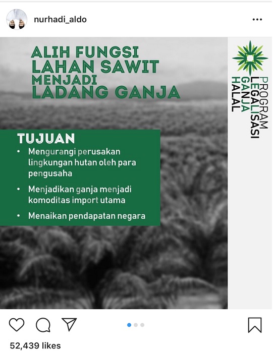 Halal Marijuana Legalisation Program: Converting palm oil plantations to marijuana fields. The green letters spell out ‘peli gajah’ (elephant penis). Nurhadi-Aldo quote reads, ‘As a masseuse of vital organs, Nurhadi says, “Peligajah is a government program that can please and improve the health of all Indonesians with a hard penis, to reduce misuse.”’