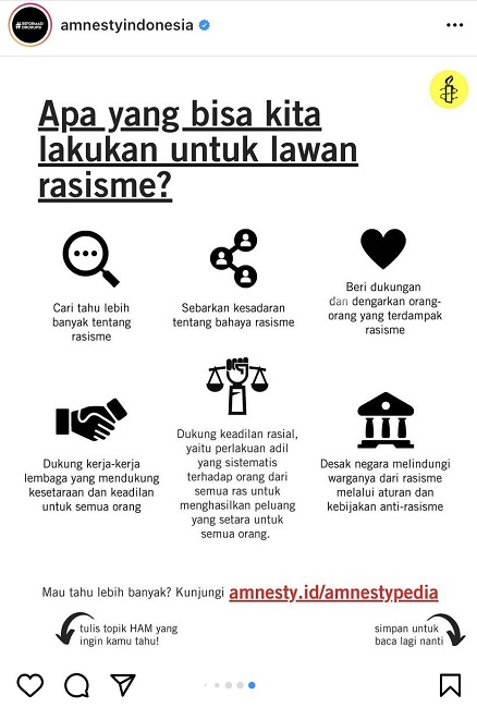 More recently, Natalius Pigai, an ethnic Papuan, also a former commissioner of the National Human Rights Commission and outspoken government critic, has been the target of racially-tinged insults from pro-government supporters. In a picture posted on Facebook, Ambroncius Nababan, the head of a pro-government volunteer group, compared Pigai to a gorilla because of remarks he had made expressing doubts about the efficacy of the Sinovac COVID-19 vaccine that the Indonesian government has purchased from China, and which it has already begun to administer.