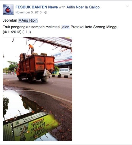 FBN adopts a citizen journalism approach: it invites the citizens of Banten to play an active role in collecting, reporting, and disseminating news relevant to the province. In practice it focuses on corruption and dynastic politics. Postings fall into three categories: poor infrastructure caused by corruption, allegations surrounding the family, and corrupt election campaigns. FBN citizen journalists, called ‘dulur’, meaning friend or comrade, post pictures and texts that bear witness to perceived injustices.
