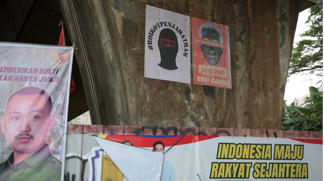 Amidst the cacophony of campaign banners, protest messages surfaced to urge the public to ‘boycott human rights offenders’, referring to Prabowo (poster on the left), or call for Jokowi’s impeachment for abuse of power (poster on the right) / Remco van Loenen