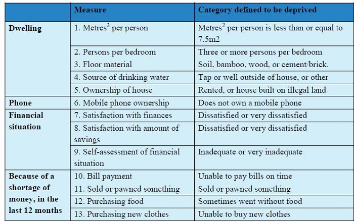High disadvantage or perceived poverty is defined as experiencing six or more of the 13 disadvantages listed in Table 1. As they aged by three years, the respondents’ living standards noticeably improved. There was a substantial decline in the number of those reporting dissatisfaction with the amount of savings they had. There was also a very large downward shift in the proportion experiencing difficulties in purchasing clothing and food. However, circumstances deteriorated between the two waves in regard to the number of persons per bedroom (perhaps because of the birth of children), ownership of one’s house (as young people leave the parental home to rent), and sources of drinking water. Crowding was a major housing problem for young families with children, potentially placing the health of the children at risk.